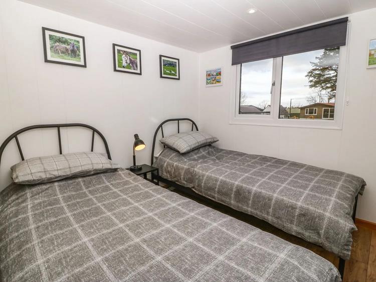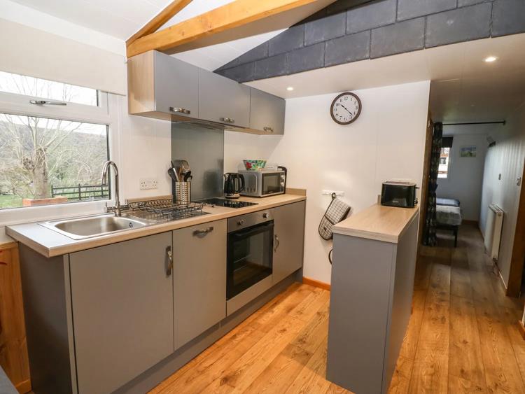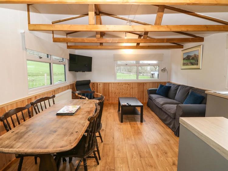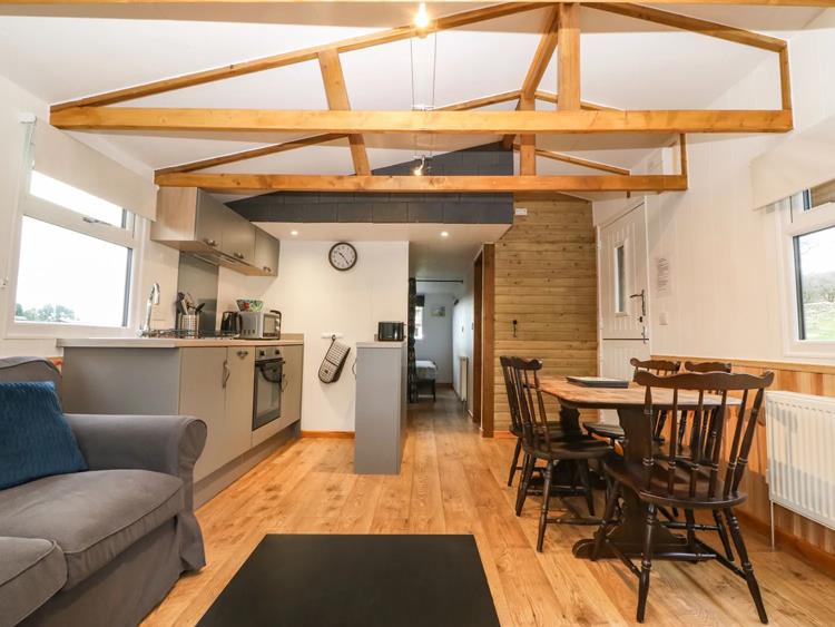 The lodge has an open plan living space with a vaulted ceiling. The fully-fitted kitchen includes a fridge, hob, oven, microwave and dishwasher.