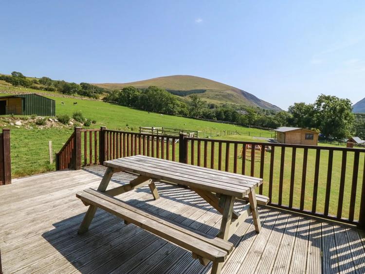 The lodge has a large decking area with uninterrupted views of the Moel Elio and Mynydd Mawr Mountains, a great place to sit, relax and enjoy the countryside