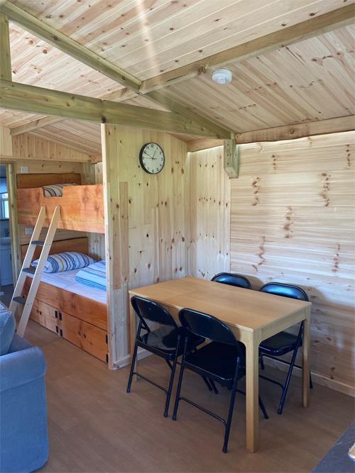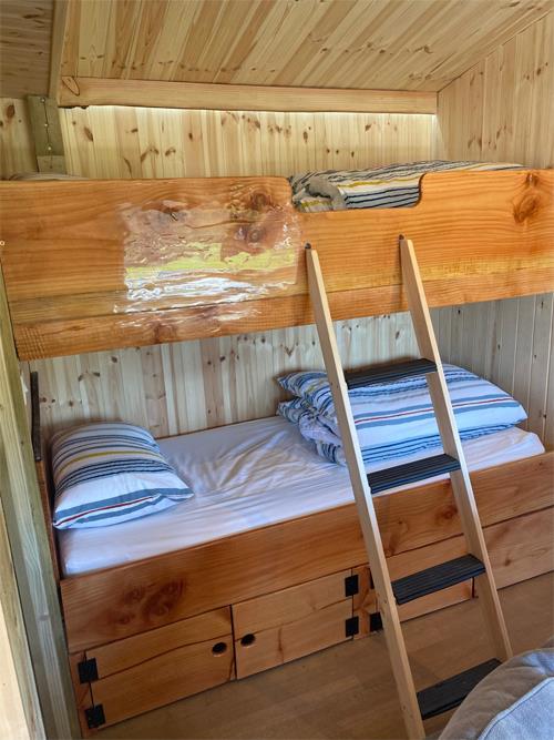This beautifully designed open-plan space sleeps up to four guests, featuring a cosy double bed and built in bunk beds.
