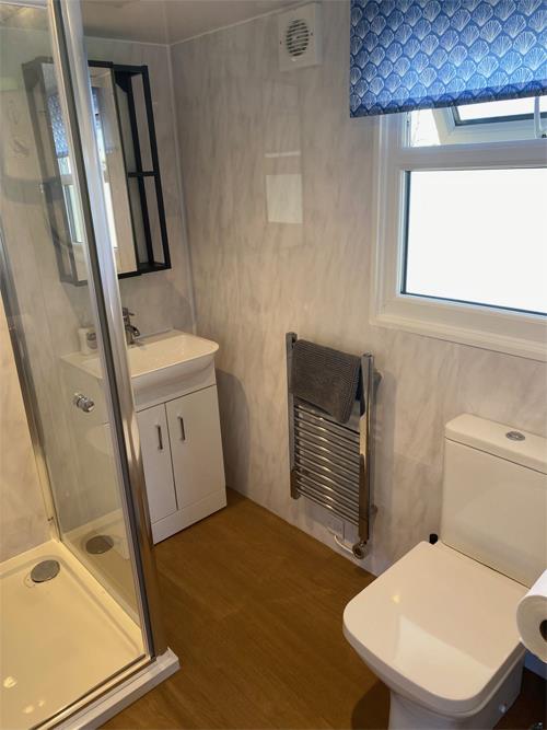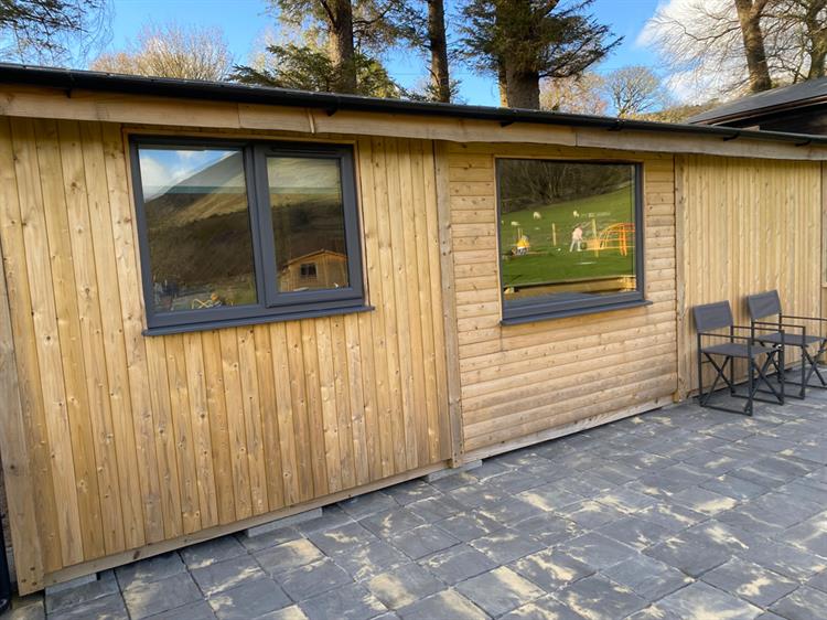 Inside, the open-plan layout features a vaulted ceiling, a fully fitted kitchen with a fridge, hob, oven and dishwasher, plus a sleek modern bathroom with a walk-in shower.