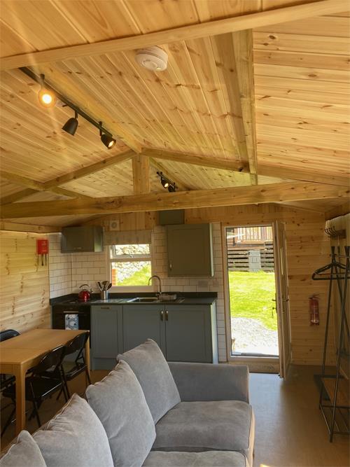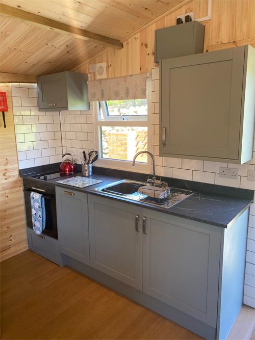 Inside, the open-plan layout features a vaulted ceiling, a fully fitted kitchen with a fridge, hob, oven and dishwasher, plus a sleek modern bathroom with a walk-in shower.