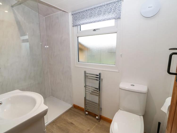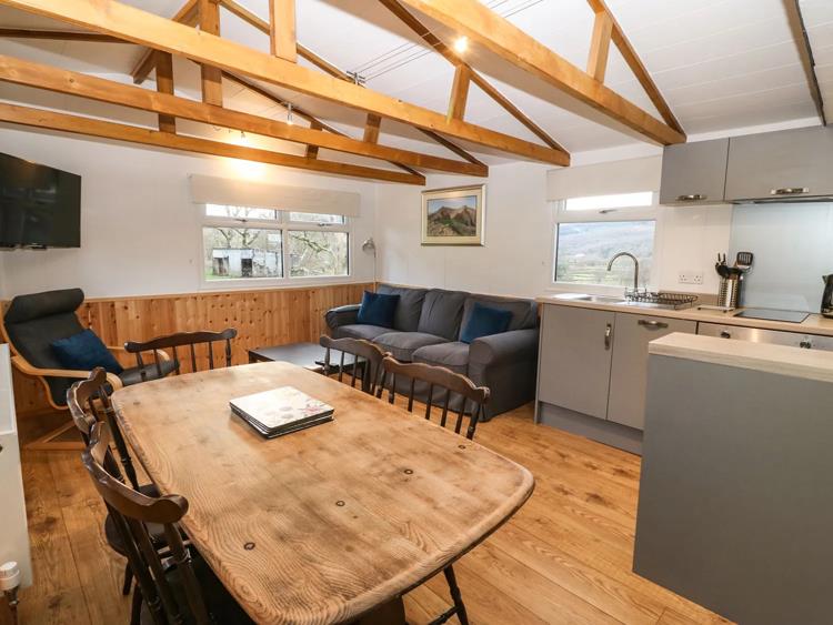 The lodge has an open plan living space with a vaulted ceiling. The fully-fitted kitchen includes a fridge, hob, oven, microwave and dishwasher.