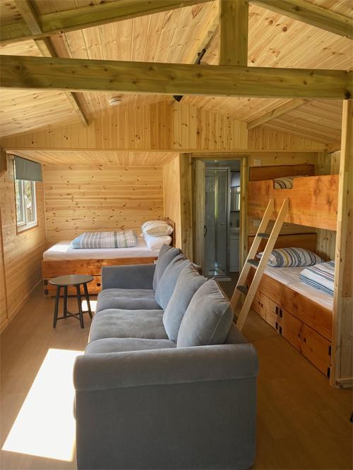 This beautifully designed open-plan space sleeps up to four guests, featuring a cosy double bed and built in bunk beds.